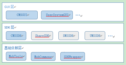 基础依赖层包含MobTools、MobCommons、SDKWrapper,是一些公共库、工具类以及SDK检测帮助类。