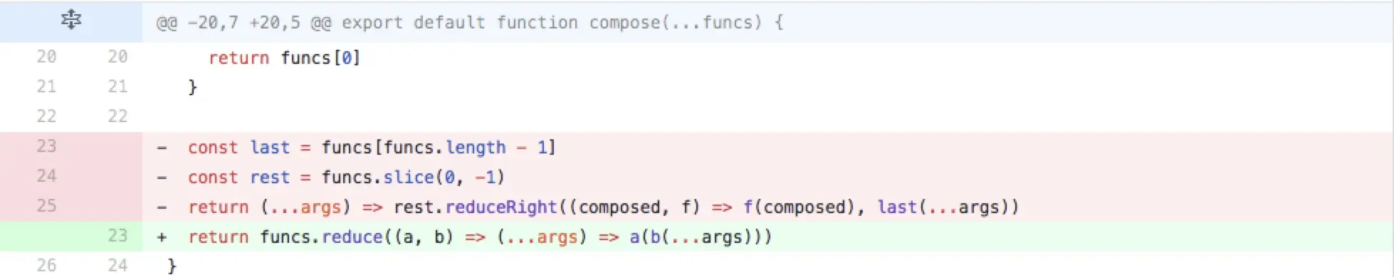 其实函数式编程的理念也贯穿到了源码中,比如里面 compose 和 middleware 的实现,这些你都可以参考源码,有意思的是其实纵使连原作者在一些函数式编程概念上也会有没意识到的地方,在一些实现上也遵循了一些pr的意见,比如 compose 的实现: