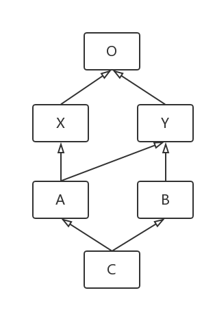 仔细看上面代码的话会发现,c.testName() 输出的与 Method Resolution Order 中所述的算法不符。在那一节中,我们知道 C 的 MRO 应该为 C A X B Y O,示例代码中按理来说应该优先调用 A 中的 testName() 函数,实际却输出了“B”……卧槽,这代码有毒的吧??