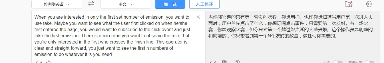 使用 Observable 构造函数可以创建任何类型的可观察流。 当执行可观察对象的 subscribe() 方法时,这个构造函数就会把它接收到的参数作为订阅函数来运行。 订阅函数会接收一个 Observer 对象,并把值发布给观察者的 next() 方法。 Rxjs创建observal的三种方式 1.创建可观察对象的函数 (1)formPromise() //承诺 (2) Interval() //定时器 (3)const mouseMoves = fromEvent(el, 'mousemove'); //事件 (4)ajax('api/data') ajax事件 2.操作符 操作符是基于可观察对象构建的一些对集合进行复杂操作的函数 take(count:number) 拿到想要的前count组数据