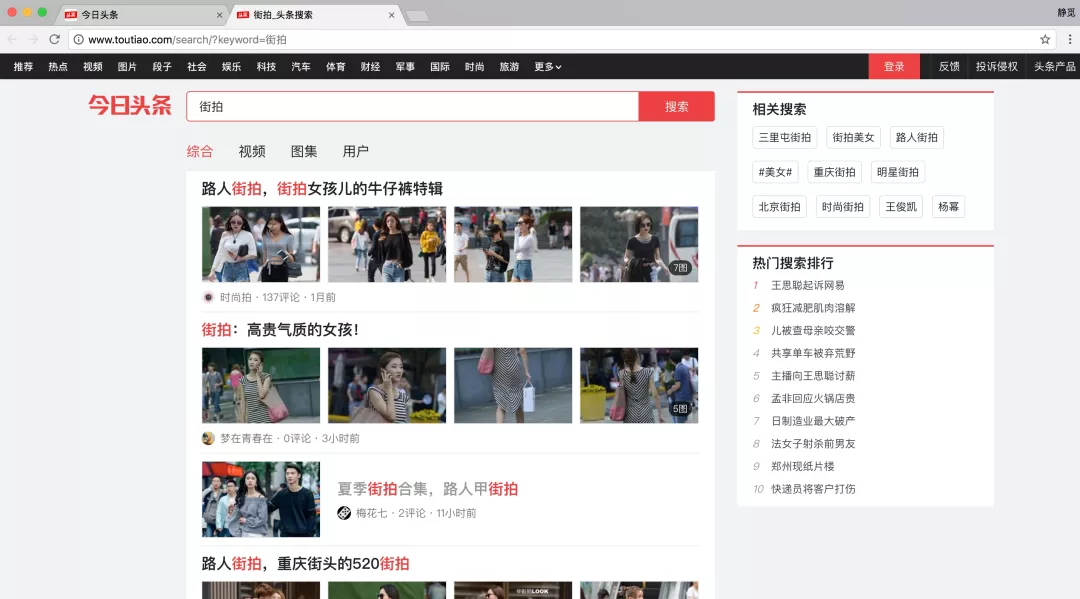 右上角有一个搜索入口,这里尝试抓取街拍美图,所以输入“街拍”二字搜索一下,结果如下图所示。