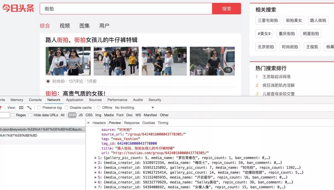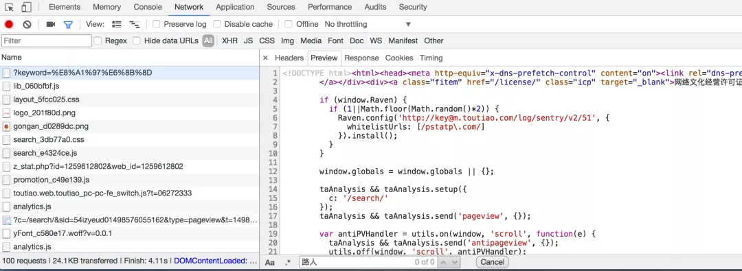 这时打开开发者工具,查看所有的网络请求。首先,打开第一个网络请求,这个请求的URL就是当前的链接http://www.toutiao.com/search/?keyword=街拍,打开Preview选项卡查看Response Body。如果页面中的内容是根据第一个请求得到的结果渲染出来的,那么第一个请求的源代码中必然会包含页面结果中的文字。为了验证,我们可以尝试搜索一下搜索结果的标题,比如“路人”二字,如下图所示。