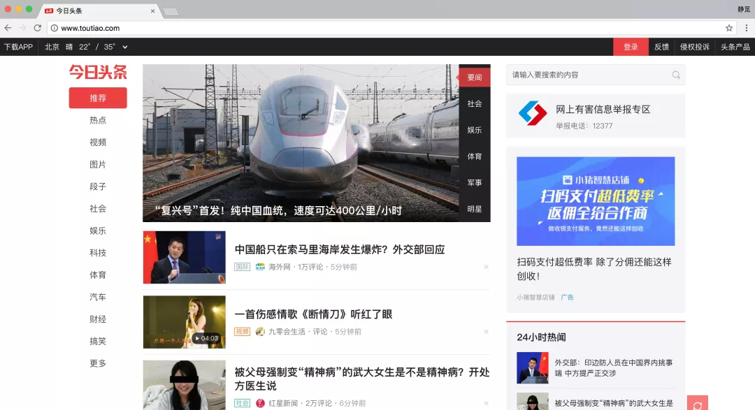 在抓取之前,首先要分析抓取的逻辑。打开今日头条的首页http://www.toutiao.com/,如下图所示。