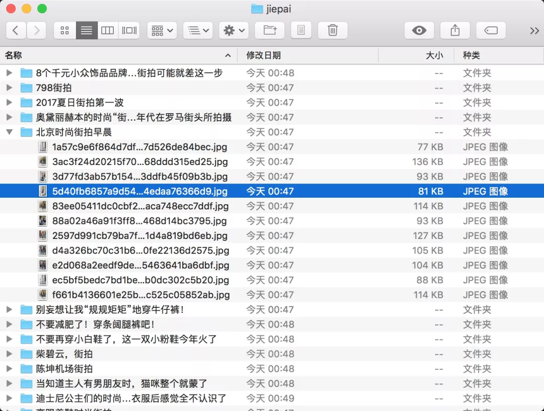 这样整个程序就完成了,运行之后可以发现街拍美图都分文件夹保存下来了,如下图所示。