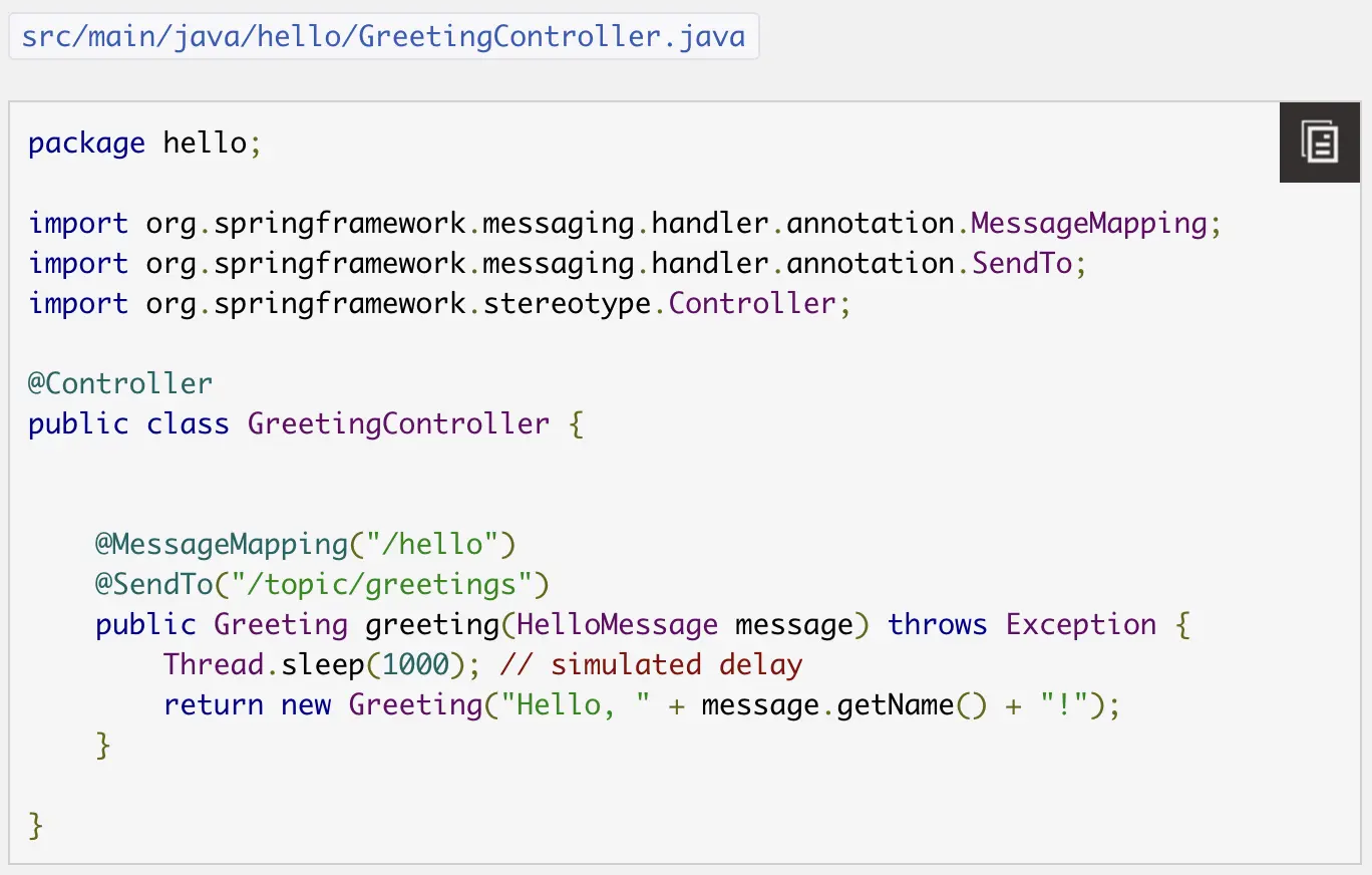 '/topic/greeting' 用于订阅,客户端send后触发,将response发个订阅的客户端