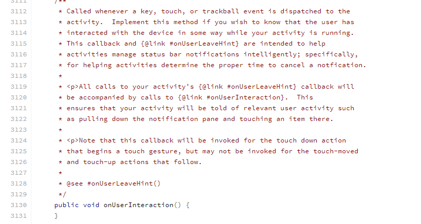 首先会判断是否是ACTION_DOWN,然后调用 onUserInteraction();从源码中了解到,其实此方法内存是空方法。主要是用来实现屏保功能,详情可以看英文注释。