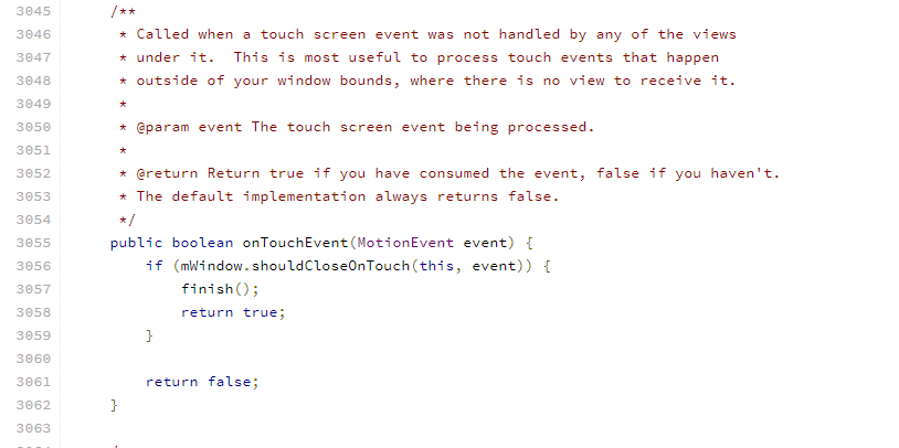 若返回的false呢,那么就调用onTouchEvent(ev);接着看看onTouchEvent (ev) ,从源码中我们可以看出此时是处理边界外的事件。