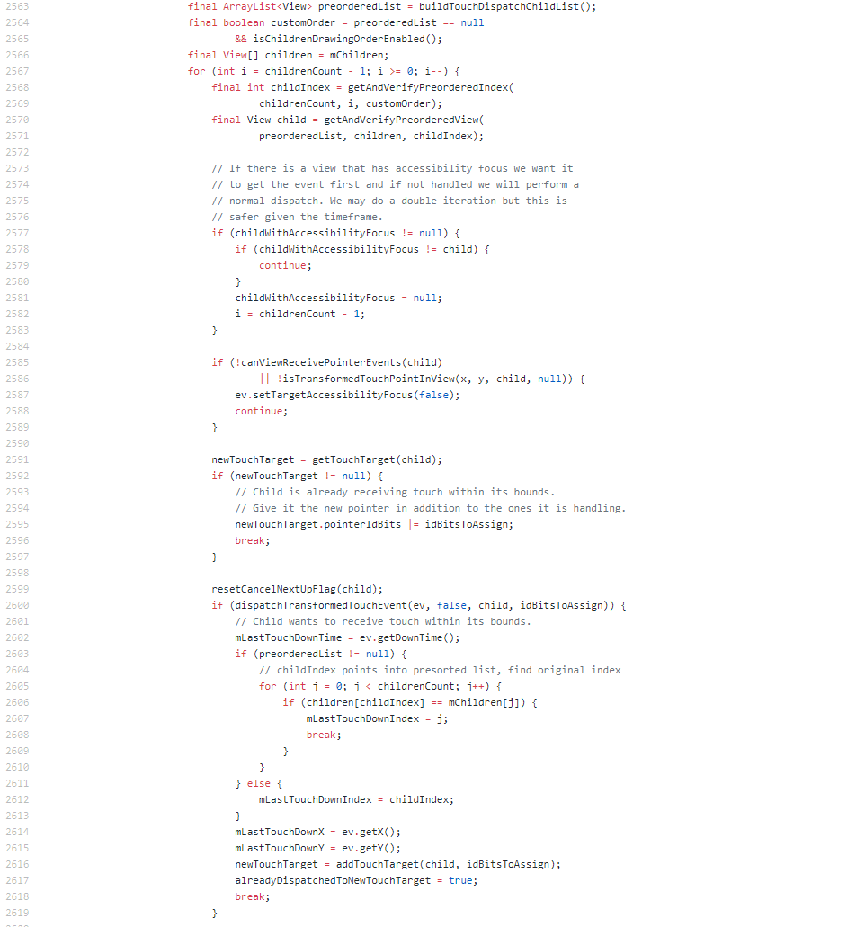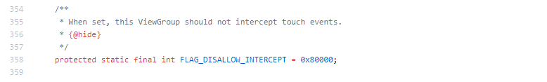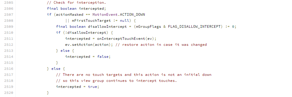 其中会判断MotionEvent.ACTION_DOWN和mFirstTouchTarget两个值。mFristTouchTarget是指若ViewGroup不拦截交由下级处理mFristTouchTarget则不为空。为空表示ViewGroup,对当前事件进行拦截。从上面我们可以到源码得注释这个FLAG_DISALLOW_INTERCEPT值也影响着ViewGroup是否拦截,因此onInterceptTouchEvent(ev)并不一定会被调用,由此也可以解决事件冲突。若ViewGruop不拦截时,紧接着看源码: