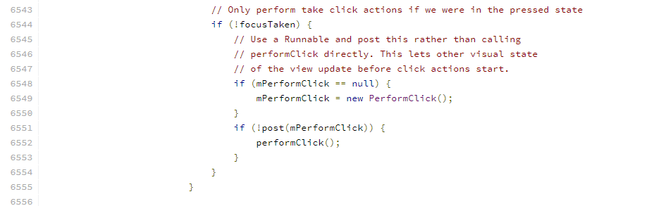 由上可以看出,首先会优先判断View的clickable和long_clickable,若其中有一个为true,进入逻辑。若我们设置了onClickListener,那么在ACTION_UP中会触发performClick :