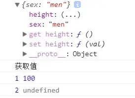 set和get方法:这两个方法会在改变量设置值和获取值时自动调用,但是这两个方法不能和writable以及value一起使用,否则会报错。当这两个方法只设置一个时,就是对应着只读或只写属性。 set方法里面设置一个变量接收将要设置的值时,可以用其他的名字,如:_height,也可以和该变量同名,如height,但是不管怎么,这个变量都不属于该对象,在外面通过对象点的方式是访问不到的,而只能访问到调用Object.defineProperty()方法设置的那个变量,即他的第二个参数。并且在打印该对象的时候,你会发现height属性后面有个(。。。),并没有直接显示该属性,以后碰到这样的,就说明他是设置了set或get方法,如下图