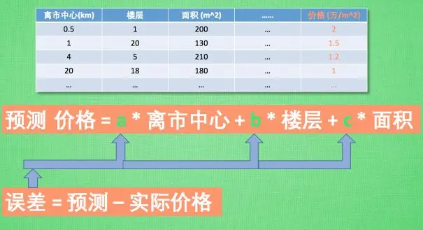 回到机器学习中, 如果我们以一个简单的线性回归方程来预测房屋的价格, 那方程可能会是这样 . 价格= a* 离市中心 + b * 楼层 + c * 面积. 其中的 a b c 就是机器学习需要努力努力再努力 来优化的参数.
