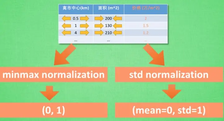 通常用于 特征标准化的途径有两种, 一种叫做 min max normalization, 他会将所有特征数据按比例缩放到0-1的这个取值区间. 有时也可以是-1到1的区间. 还有一种叫做 standard deviation normalization, 他会将所有特征数据缩放成 平均值为0, 方差为1. 使用这些标准化手段. 我们不仅可以快速推进机器学习的学习速度, 还可以避免机器学习 学得特扭曲.