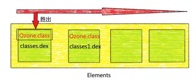 可以看出当有多个dex文件时,他们会组成一个有序数组,按顺序加载,而对于一个已经加载的Class是不会再次加载的,由此得出热修复方案:把需要修复的类打包成一个dex文件下发,并在APP启动时通过反射,将这个dex文件放在dexElements的最前面,这样修复了的Class就会比有Bug的Class优先加载了。如下图所示: