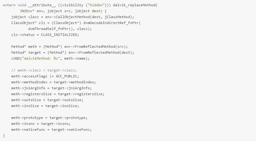 阿里的Andfix热修复方案是底层替换方案的代表,与Qzone和Tinker的思想完全不同,Andfix通过修改一个方法的入口地址来达到修复。以Dalvik虚拟机为例,Andfix的核心代码如下: