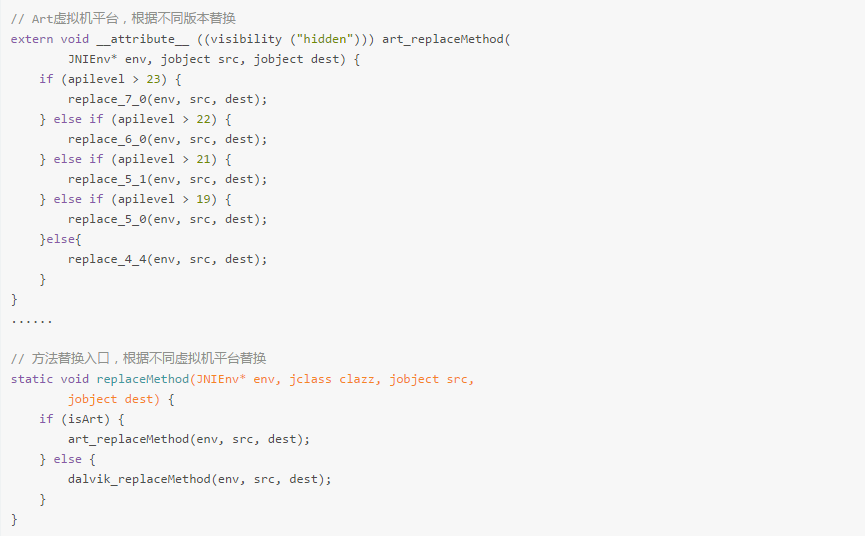 最初Qzone就需要在Dalvik平台进行插桩,Tinker同样也是分平台合成(在Dalvik平台合成全量Dex,在Art平台合成需要的小Dex),而阿里的Andfix作为底层热修复方案,不仅要面对两种虚拟机平台,甚至要为不同Android版本编写一套替换逻辑,如下: