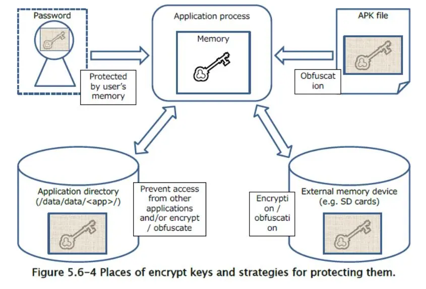 首先,“图 5.6-4 加密密钥的位置和保护它们的策略”,说明了 Android 智能手机和平板电脑中,用于储存密钥和相关用途的各种位置,并概述了保护它们的策略。
