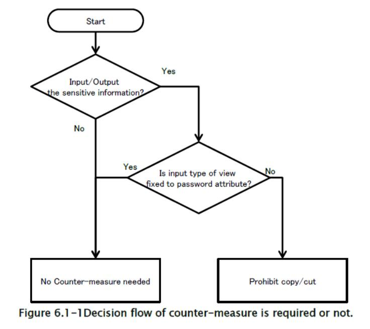 对策的必要性可以根据图 6.1-1 的流程确定。 在图 6.1-1 中,“输入类型固定为密码属性”表示,输入类型在应用运行时必须是以下三种之一。 在这种情况下,由于默认禁止复制/剪切,因此不需要采取对策。