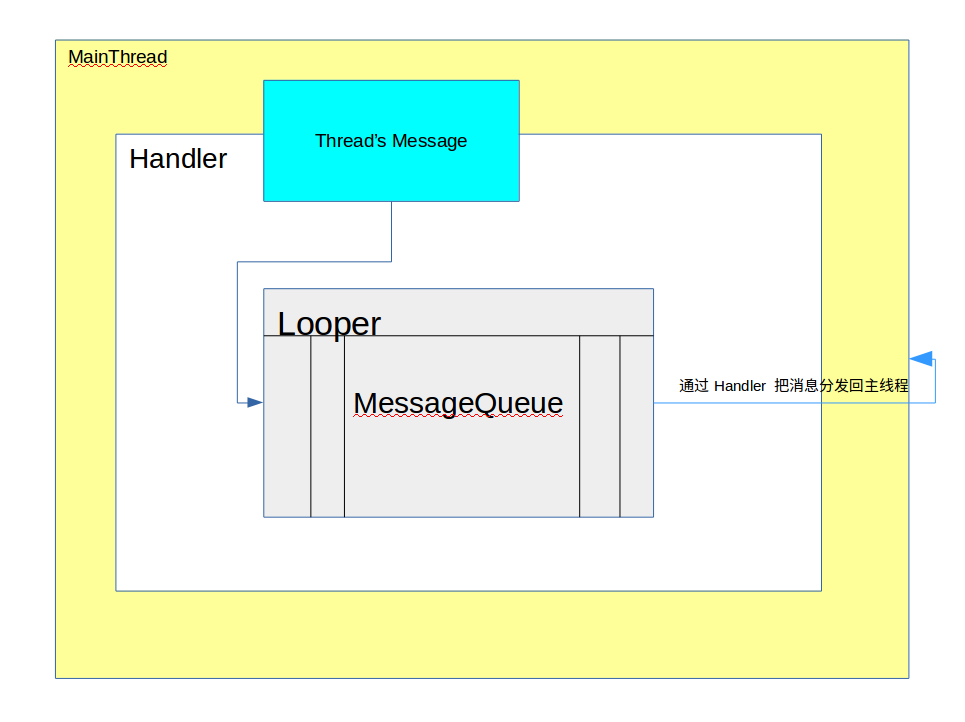 对上面源码的总结,主要就是: Handler 负责把子线程中传进来的消息(Message),传递给 Looper,由 Looper 把消息封装成消息队列,然后再有 Handler 从消息队列中把消息分发到子线程外面。
