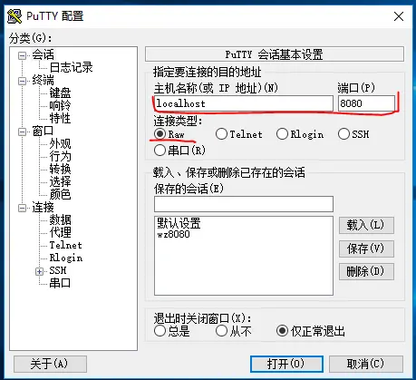 或用putty工具来访问服务,我的设置如下,打开一个与服务器的连接后,回车即发送内容到服务