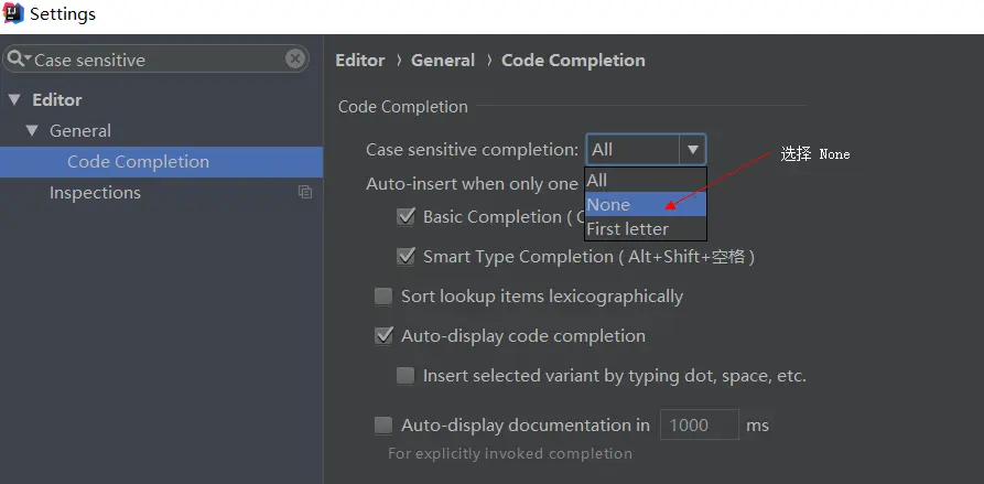 Settings -> 搜索 Case sensitive -> 设置 Case sensitive completion 为 None