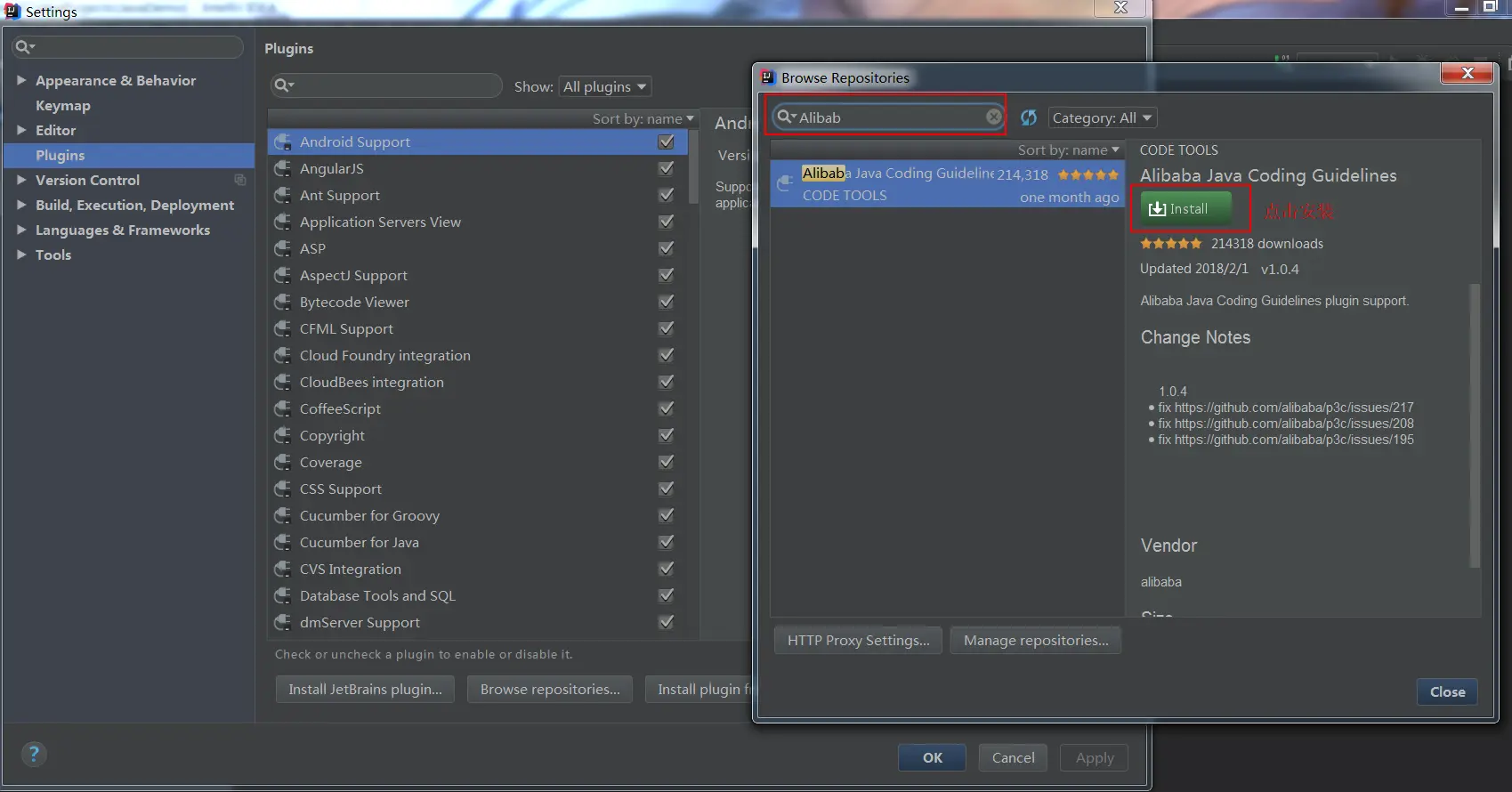 Settings -> Plugins -> Browse Repositories -> 搜索 Alibaba