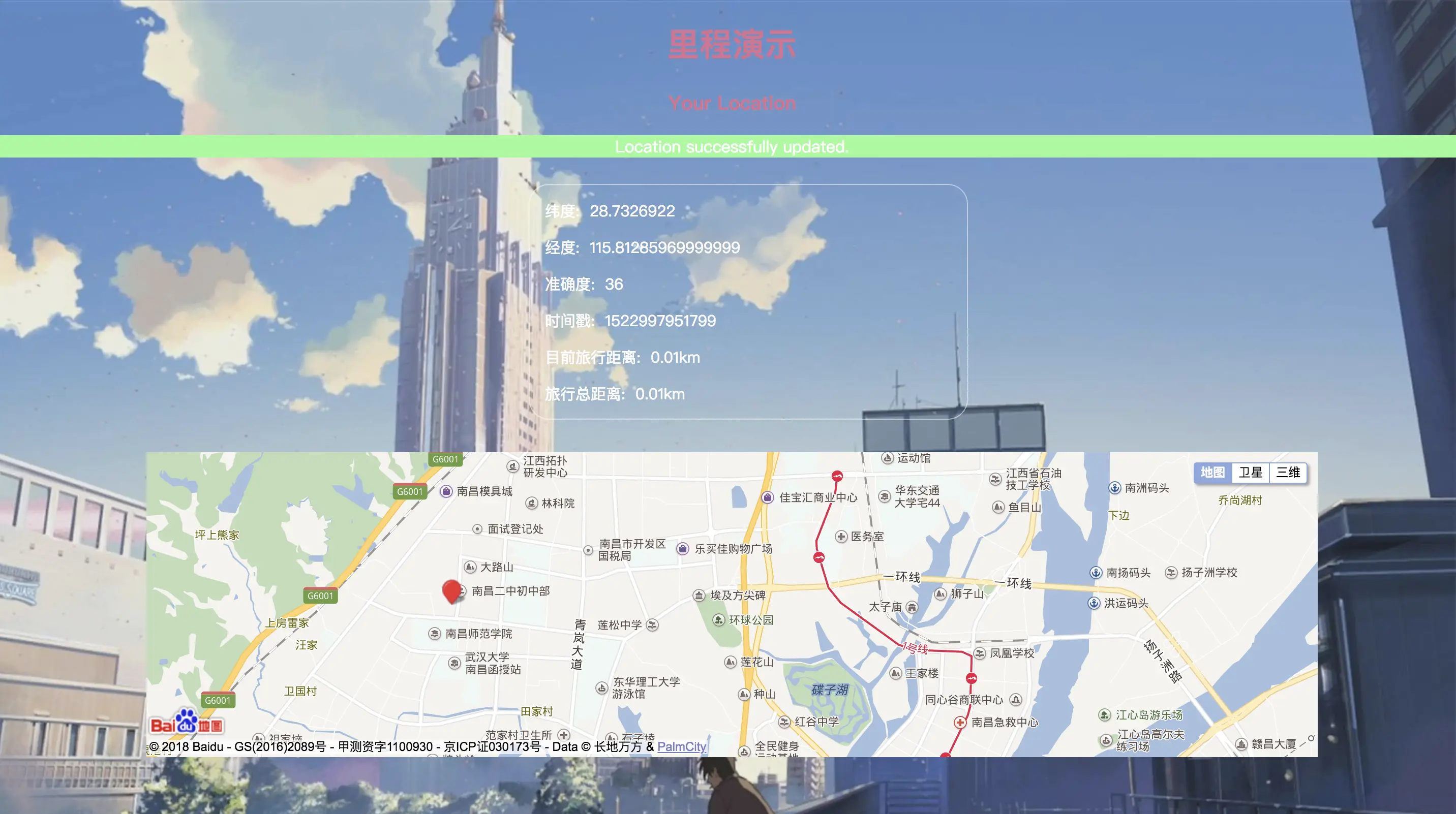 在不断获取位置的同时,调用updateLocation这个方法,把位置情况显示在页面上,当然还要调用计算距离的方法来获取距离,以及不断更新百度地图上的位置。
