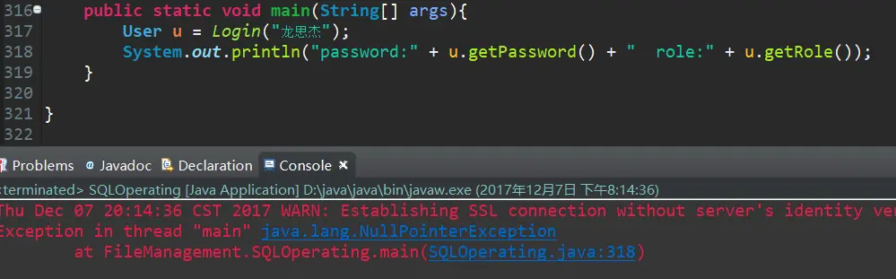 我是用我的名字做的查询,NullPointerException,很明显,没有用我的名字查到对应的数据,而数据库中是存在的。这是为什么呢?