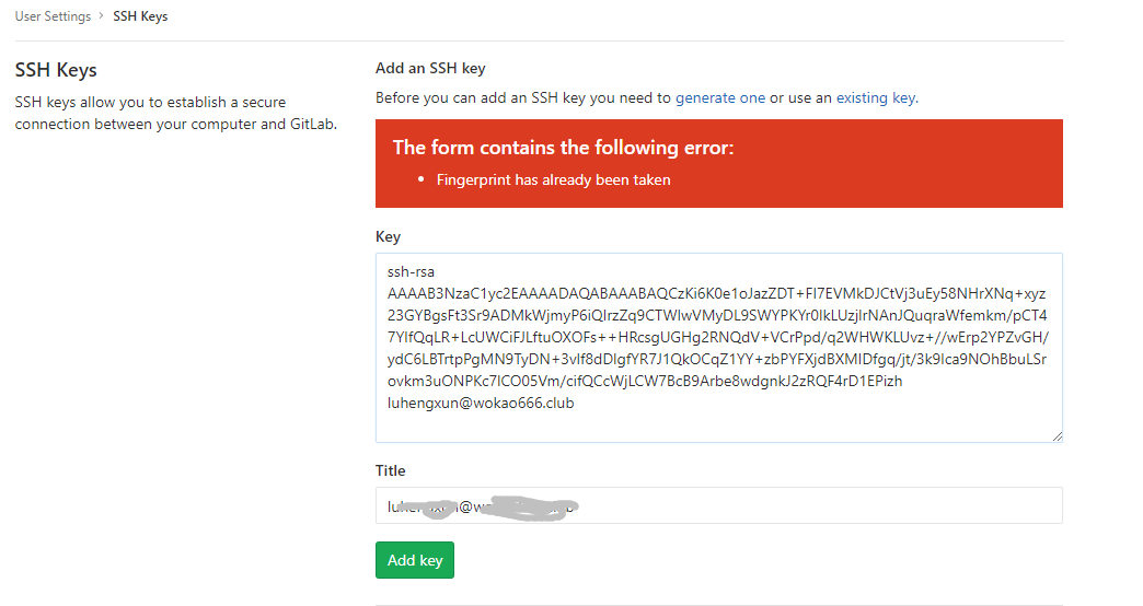 当一个ssh key在gitlab平台上配置超过1次,报出以下错误: