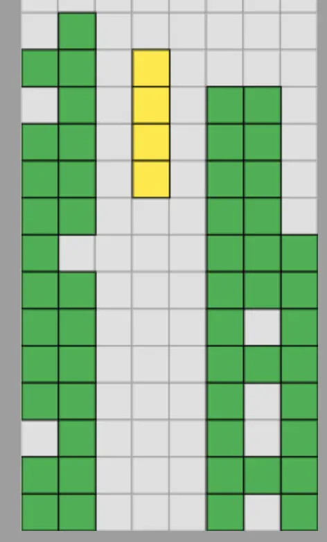 每完成一个移动的动作后,我们都需要进行方块的触底检测。 也就是判断当前方块下,是否已经有元素占位,如果有的话,则表示已经触底了,当前元素就会被固定进矩阵数组中。 同样的,我们在判断时,不需要将方块所有的下标都检查一遍,只需要检查最底部一层的有效元素即可。