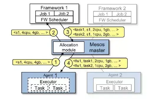 二层调度:下层调度框架给上层调度框架提供粗粒度的资源offer请求,上层使用调度算法将任务分配到这些资源上。