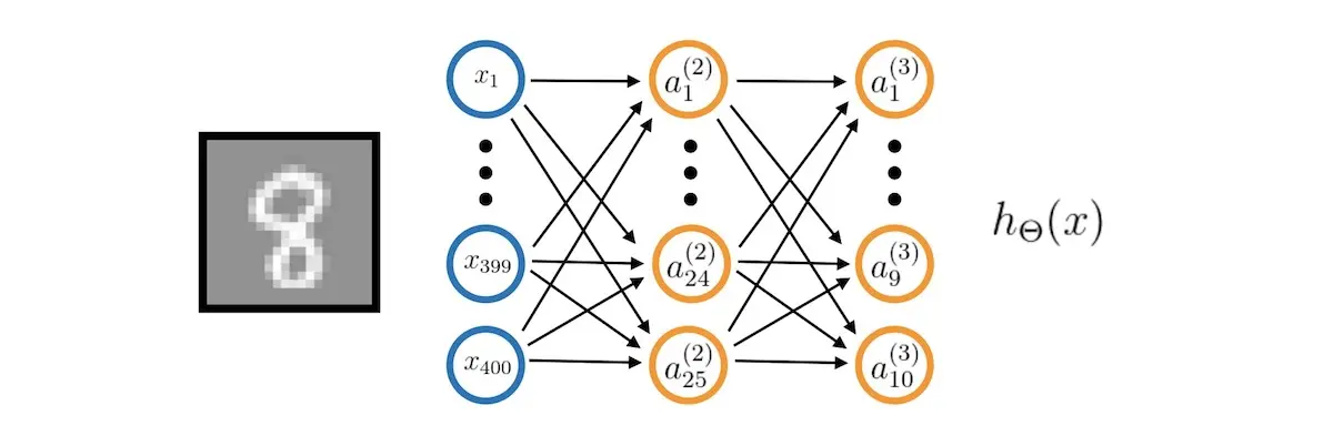 本周课程最后回到我们的 多分类问题 问题,我们构造一个 神经网络 来完成手写字符识别的任务。网络的输入为 20x20 的图片,所以输入层有 401 个单元。我们需要归类 0 ~ 9 的 10 个数字,所以输出层有 10 个单元,第 个单元表示图片为
