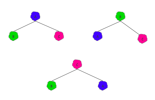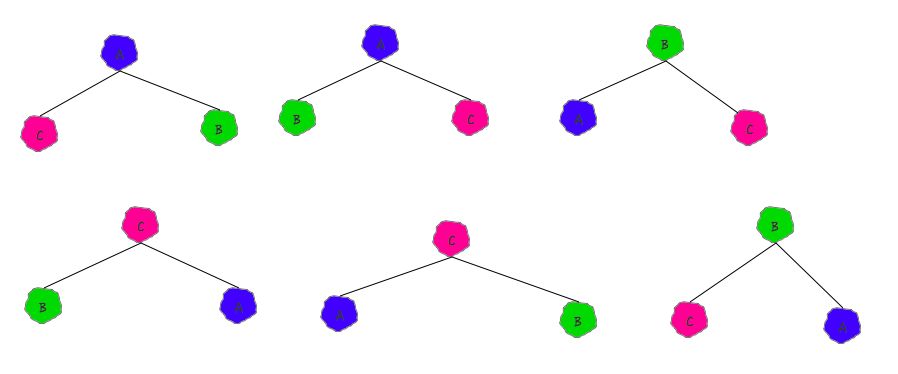 再来详细说说他的数据存储方面的事情,前面说了,他存储的数据之间只有父子节点间有关系。如果你让他帮你存储A、B、C三个数据的话,1个父节点,2个子结点的情况有 3 种。