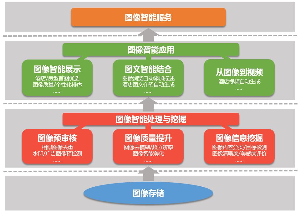 图像智能处理与挖掘是酒店图像智能化的基础,包括图像预审核、图像质量提升和图像信息挖掘三个环节。