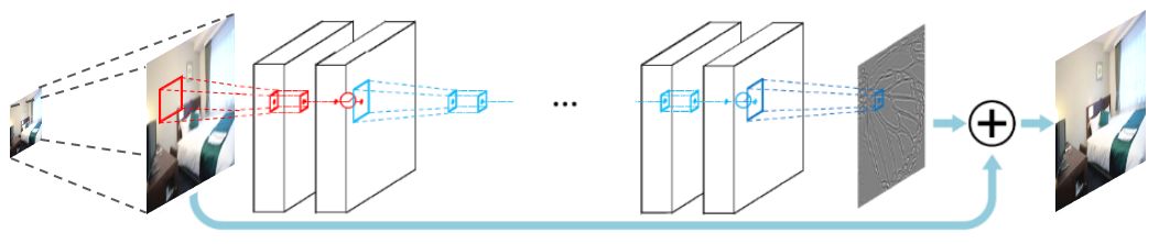 在真实的小图放大场景中,我们选择VDSR来构建超分辨率网络,结构如上图所示。具体地,我们组合多种倍数的图像样本进行混合训练,令一个模型能够同时适应多种不同倍数的超分辨率。