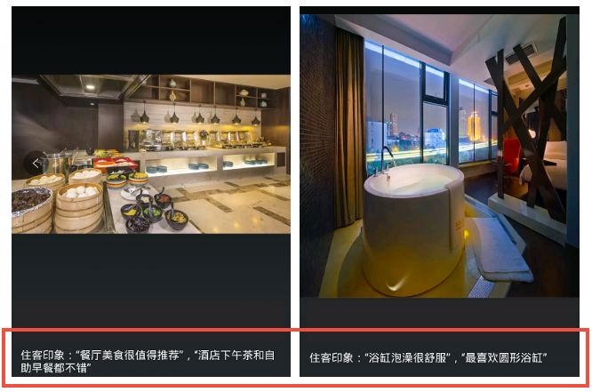点评不仅流畅而且自带情感,用户在浏览图像的同时可以看到其他用户对该图像内容的真实评价,方便快捷地提升了用户获取酒店信息的丰富度和可靠性,用户浏览费力度也得到显著下降。下图展示了图像浏览中结合点评描述的应用场景。