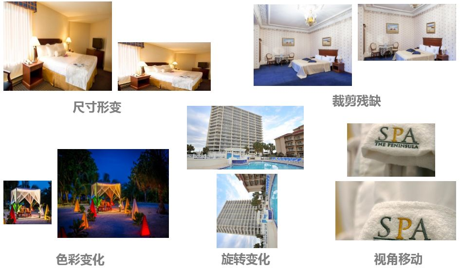 酒店图像之间的相同/相似主要表现为1)尺寸形变; 2)裁剪残缺;3)色彩变化;4)旋转变化; 5)拍摄视角移动等多种情况,如下图所示。