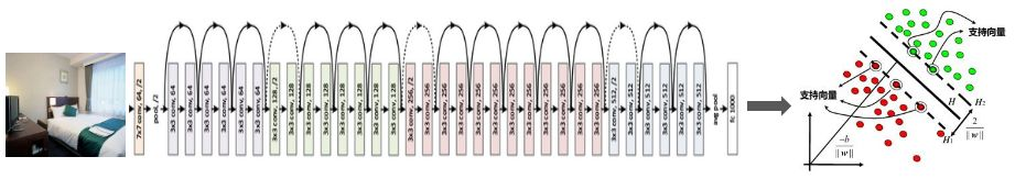 在数据集标注的过程中,由于图像好看与否主观性依赖很强,所以我们综合了多人评判结果作为每张酒店图像好看与否的标注。由于图像经过翻转、裁剪或色彩抖动都会令图像的美感度发生变化,所以我们未对数据集进行数据增强。为了防止直接微调网络出现过拟合,我们转而利用特征迁移,在ResNet 的深层特征表达基础上,训练支持向量机实现酒店图像好看/不好看的二元分类模型,模型结构如上图所示。通过图像质量评价,我们获取了酒店图像的质量分数,为后续图像智能应用提供了重要依据。