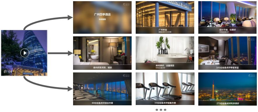 为每家酒店拍摄视频需要投入大量人力物力,为了快速获取酒店高质量精美视频,我们利用酒店图像来自动生成酒店视频。具体地,我们借助图像挖掘中获取的丰富的图像信息,设计了一个智能选图系统,实现视频图像的自动挑选。同时,我们通过酒店的文本信息自动匹配相应的字幕。下图展示了一个酒店视频包含的部分图像和字幕。