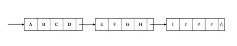 对于串的链式存储结构,与线性表是相似的,但由于传结构的特殊性,结构中的每个元素数据是一个字符,如果也简单的应用链表存储串值,一个结点对应一个字符,就存在很大的内存浪费。因此一个结点可以存放一个字符,也可以考虑存放多个字符,最后一个结点若是未被占满,可以用井号或其他值将其填满。
