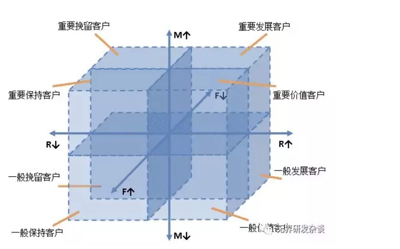 而我们的目标是通过对每个用户的RFM属性进行计算,将用户群体划分为不同的种类进行区分,以便我们进行分析和精准营销。例如我们可以分析出高价值用户,重点发展用户,流失用户等群体进行针对性营销动作。