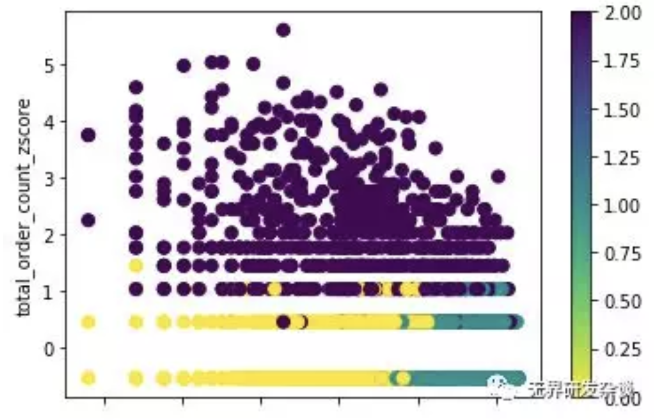 可以看到不同的颜色代表不同的用户类别,可以简单的认为标记为0的是流失用户,1是重点发展用户,2是高价值用户。这样我们就可以对不同的群体使用适合的营销策略了,同时当有新的用户加入后,我们也可以使用得到的k-means模型对其进行预测划分。