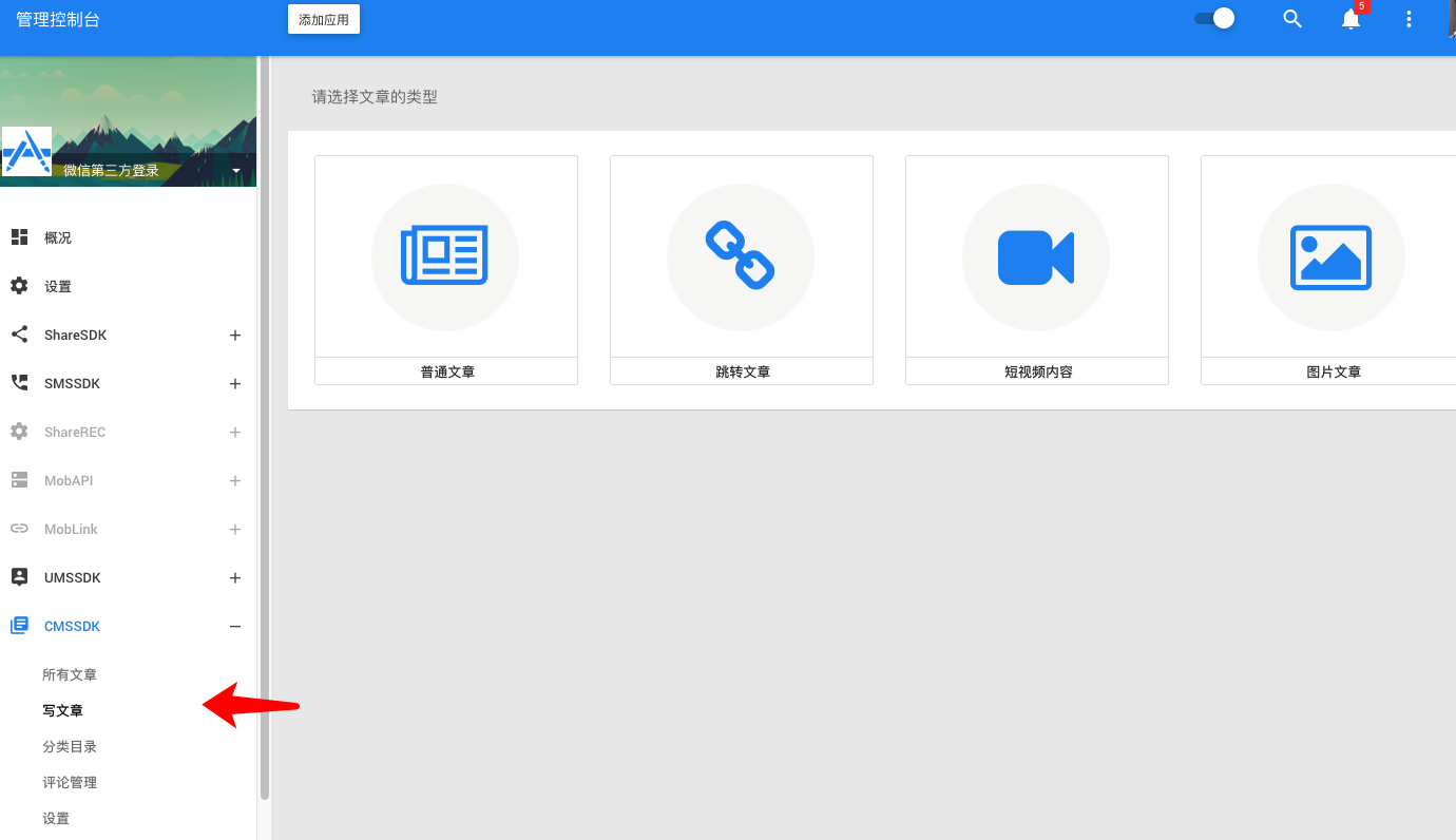 然后可以新建文章(如下图)和编辑内容、创建文章封面图、设置文章分类等。新建文章后,可以选择文章类型。目前支持4类文章:普通文章、跳转文章、短视频内容和图片文章,这个数据可以通过CMSSDK的CMSSDKArticle中的CMSArticleType属性获取。关于文章的数据如标题、内容、封面图、文章发布时间等数据都在CMSSDKArticle类中。