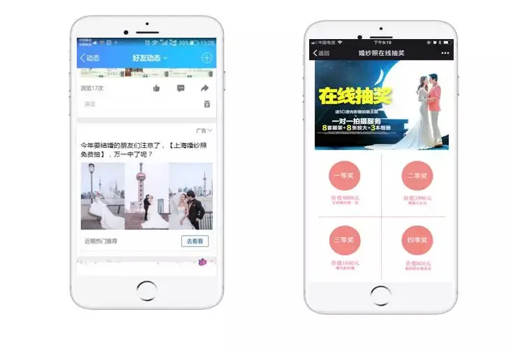 素材选择3张精美的婚纱街拍,配合上海标志性建筑,更易给用户营造真实感,标题“今年要结婚的朋友们注意了,【上海婚纱照】免费抽,万一中了呢?”以免费吸睛,大大增加了点击率,为落地页收集线索打下了很好的基础。