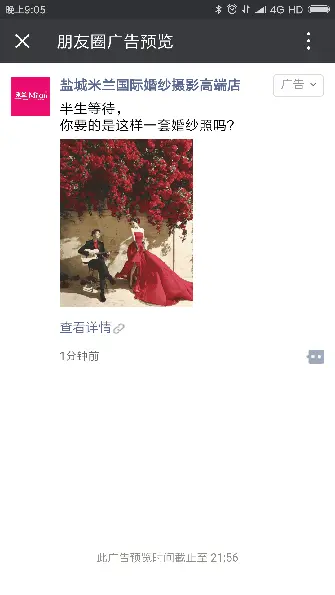 盐城米兰国际婚纱摄影自2017年投放微信朋友圈广告,就将朋友圈广告作为获客的重要通道,以新品曝光+节日优惠+团购等活动引起消费者注意,客片则选取当季最受欢迎的系列,如9月的玫瑰花墙系列等,配合文艺范儿的文案“半生等待,你要的是这样一套婚纱照吗”深入打动目标受众,结合定向(性别女+年龄22-35岁等标签)吸引目标客户线上预约,实现品效合一。