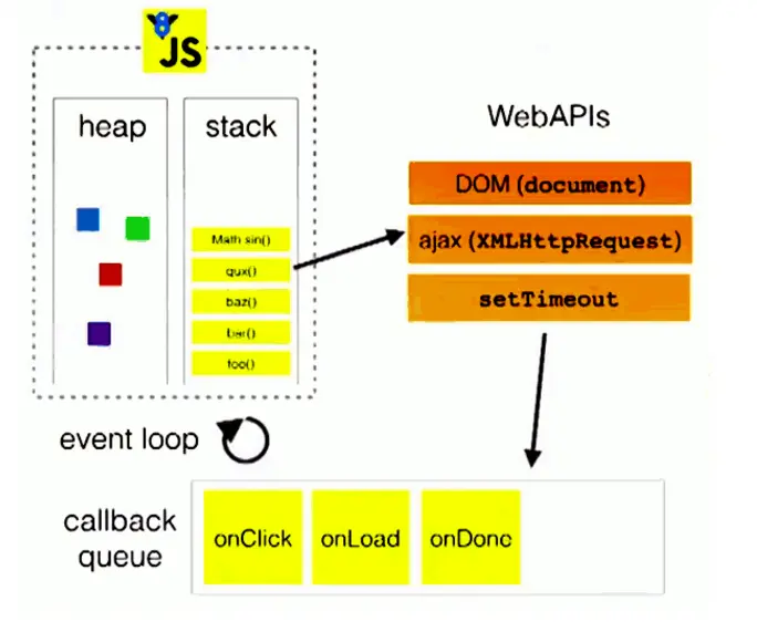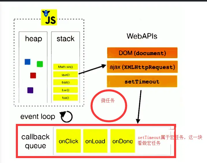 图解:如图,事件环分成几部分。js分为两部分,一个叫heap(堆),一个叫stack(栈);对象放在heap(堆)里,常见的基础类型和函数放在stack(栈)里,函数执行的时候在栈里执行。栈里面可能会调一些Dom操作,ajax操作和setTimeout定时器。stack(栈)里面的程序先走,走完后再走WebAPIs(异步的方法),WebAPIs(异步的方法)执行后的结果放在callback queue(回调的队列里),也就是当栈里面的程序走完之后,再从任务队列中读取事件放到栈里面去执行,这个过程是循环不断的。