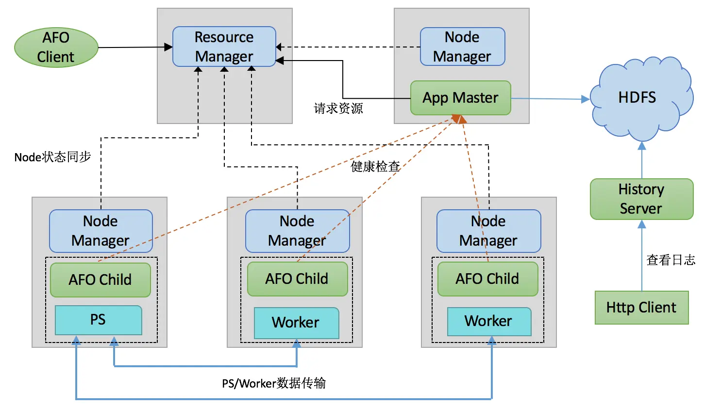 TensorFlow只是一个计算框架,没有集群资源管理和调度的功能,分布式训练也欠缺集群容错方面的能力。为了解决这些问题,我们在YARN基础上自研了AFO框架解决这个问题。 AFO架构特点: