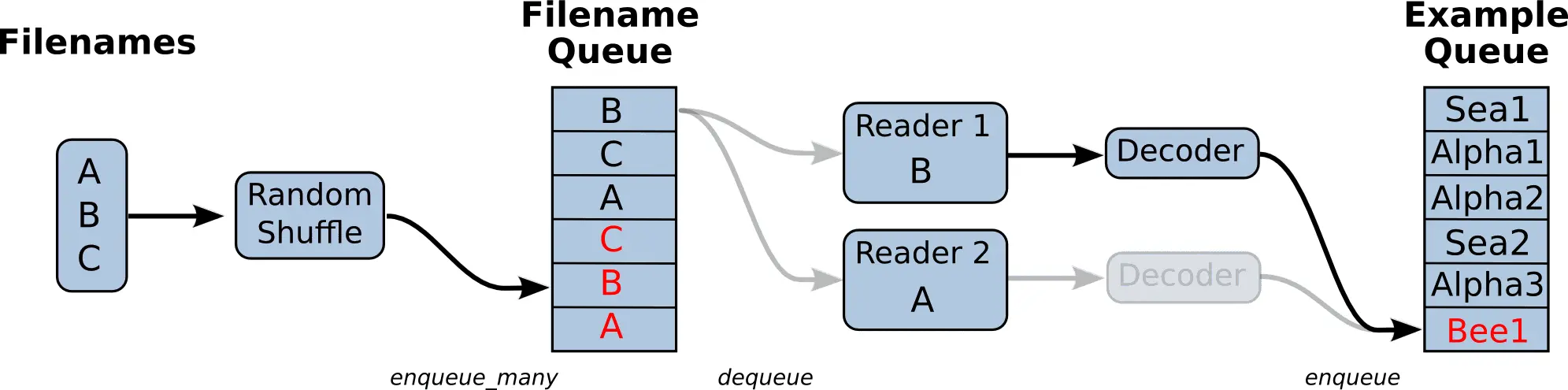 TensorFlow支持以流水线(Pipeline)的方式输入训练数据。如下图所示,典型的输入数据流水线包含两个队列:Filename Queue对一组文件做shuffle,多个Reader线程从此队列中拿到文件名,读取训练数据,再经过Decode过程,将数据放入Example Queue,以备训练线程从中读取数据。Pipeline这种多线程、多队列的设计可以使训练线程和读数据线程并行。理想情况下,队列Example Queue总是充满数据的,训练线程完成一轮训练后可以立即读取下一批的数据。如果Example Queue总是处于“饥饿”状态,训练线程将不得不阻塞,等待Reader线程将Example Queue插入足够的数据。使用TensorFlow Timeline工具,可以直观地看到其中的OP调用过程。