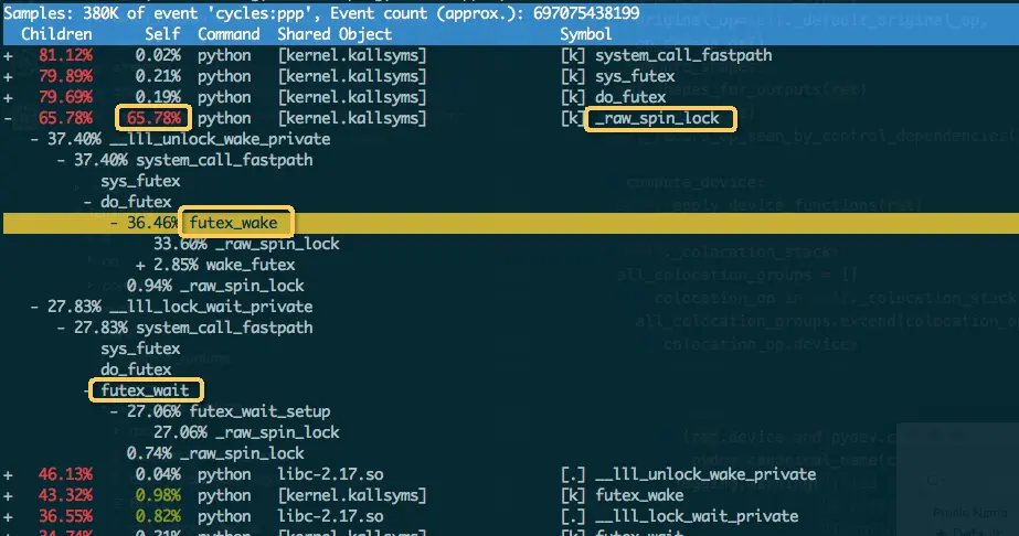在使用分布式TensorFlow 跑广告推荐的WDL算法时,发现一个奇怪的现象:WDL算法在AFO上的性能只有手动分布式的1/4。手动分布式是指:不依赖YARN调度,用命令行方式在集群上分别启动PS和Worker作业。 使用Perf诊断PS进程热点,发现PS多线程在竞争一个内核自旋锁,PS整体上有30%-50%的CPU时间耗在malloc的在内核的spin_lock上。