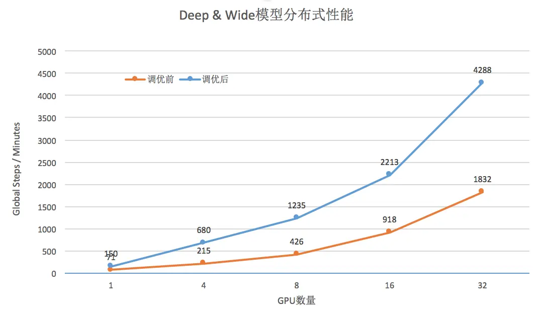 我们在AFO上针对业务的WDL模型做了性能调优前后的比对测试,测试环境参数如下: 模型:推荐广告模型WDL OS:CentOS 7.1 CPU: Xeon E5 2.2G, 40 Cores GPU:Nvidia P40 磁盘: Local Rotational Disk 网卡:Mellanox 25G(未使用RoCE) TensorFlow版本:Release 1.4 CUDA/cuDNN: 8.0/5.1