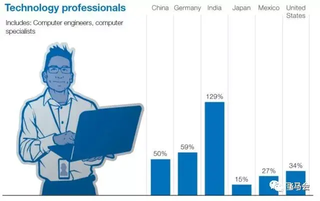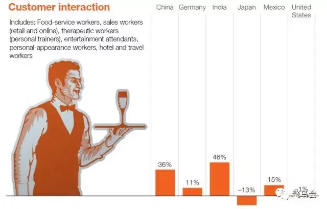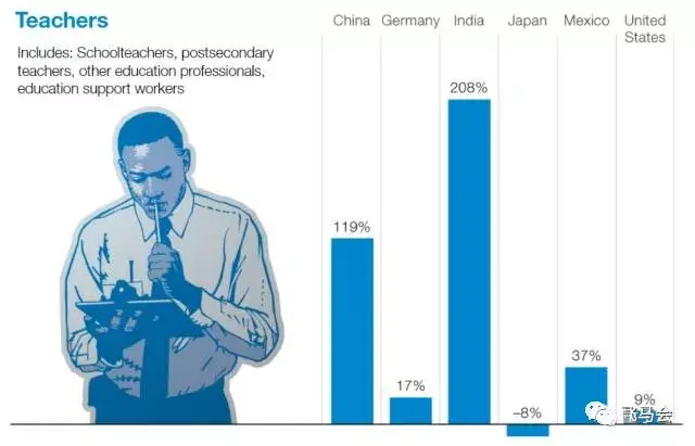 在报告中,麦肯锡特别指出,被机器人取代并不意味着大量失业,因为新的就业岗位将被创造出来,人们应该提升工作技能来应对即将到来的就业大变迁时代。就中国而言,在自动化发展迅速的情境下,到 2030 年约有 1 亿的人口面临职业转换,约占到时就业人口的 12%。虽然这个数字可能看起来很大,但与过去二十五年中有数千万已经离开农业的中国人相比,这个数字还是比较小的。